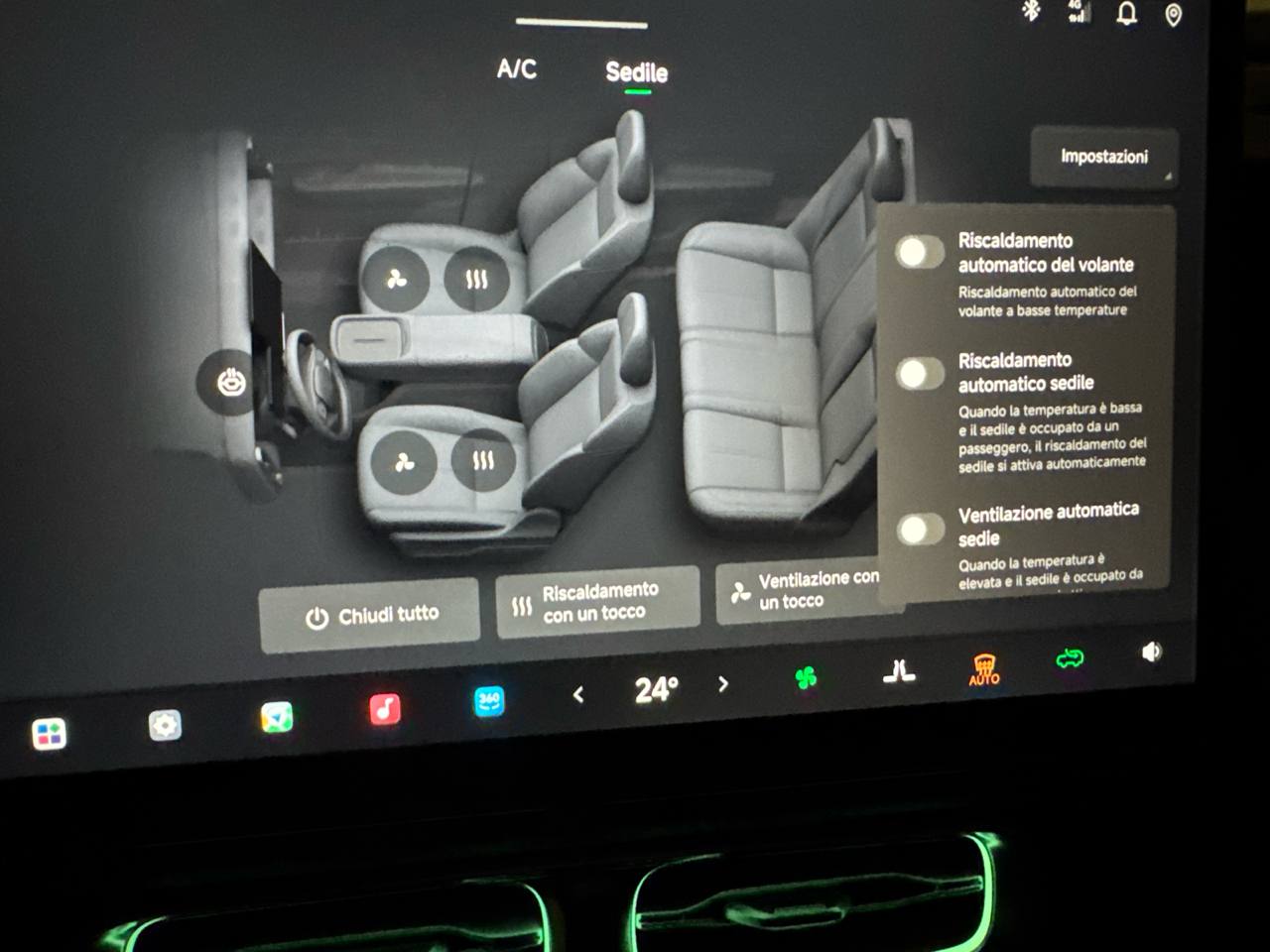 Klicken Sie auf den Temperaturwert im Hauptdisplay. Standardmäßig wird der Tab A/C aufgerufen. Es gibt einen weiteren Bereich namens Sitz. Wenn Sie auf dieser Seite sind, klicken Sie auf Einstellungen und von dort aus können Sie auch die automatische Heizung bei niedrigen Temperaturen deaktivieren.